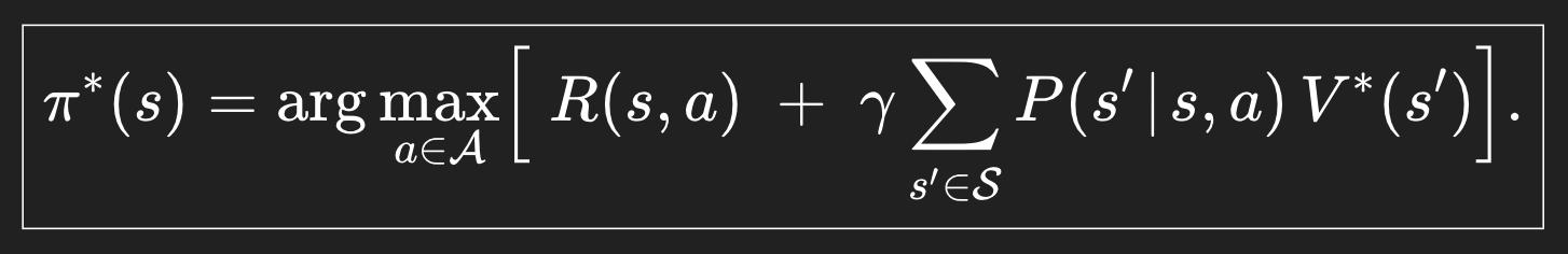 그리고 이제 최대 value를 계산했으니 여기서 policy를 뽑아내자. 어떻게? 저 값을 max 해주는 a를 찾으면, 그게 policy이다. policy는 state -> action 이렇게 매핑해주는 함수이고, 결과값이 action이 되기 때문이다.