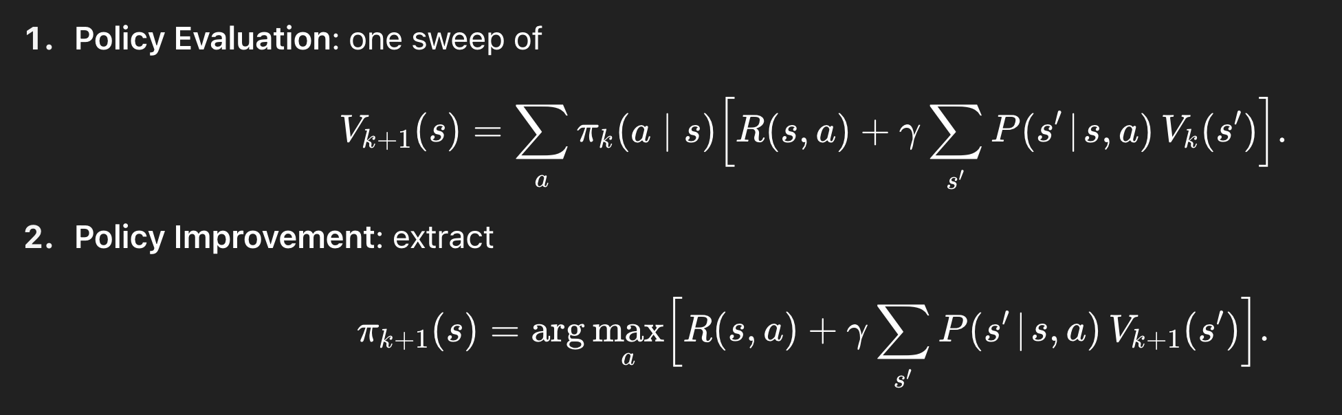 다만 Policy iteration의 경우에는 먼저 특정 policy를 evaluation 해주고, 그 다음 더 나은 policy로 improvement 해주는 과정을 거치는 반면,