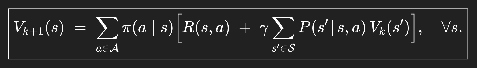 지금 가지고 있는 어떤 policy π에 따른 value를 iteratively하게 계산하는 것이다. 왼쪽을 보면 k+1로, V0부터 V1, V2, 이런 식으로 값이 나올 것을 알 수 있다.
