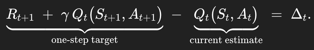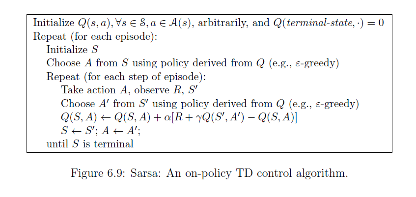 SARSA는 TD(0)인데 value function 업데이트를 action-value function으로 바꿔주면 된다.