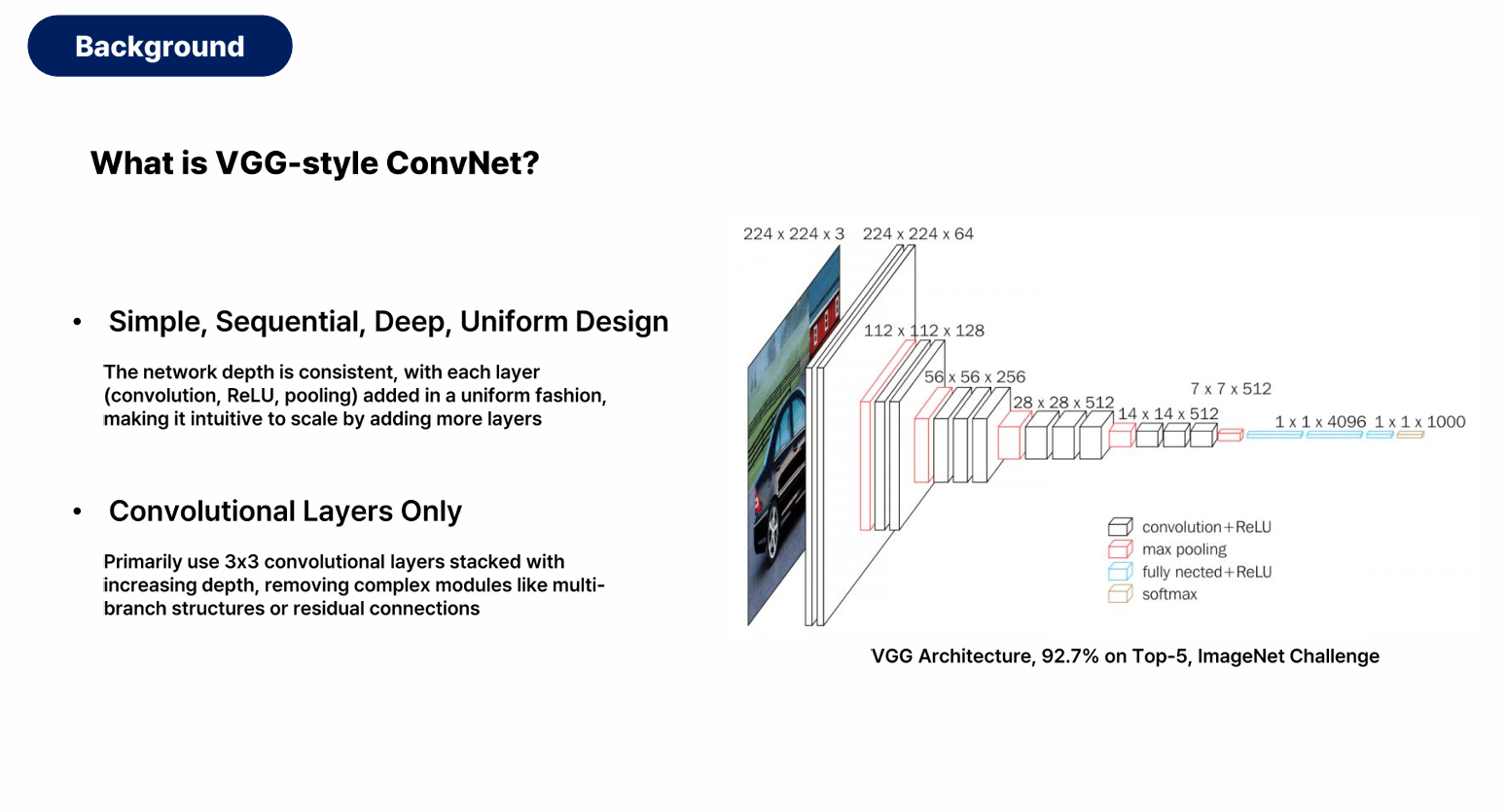 VGG 계열은 단순하고(Sequential), 깊고(Deep), 균일한(Uniform) 설계가 직관적이라, 구현/최적화/배포 측면에서 매력적이다.