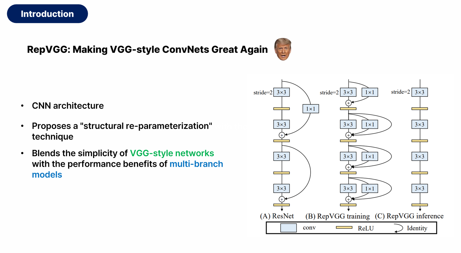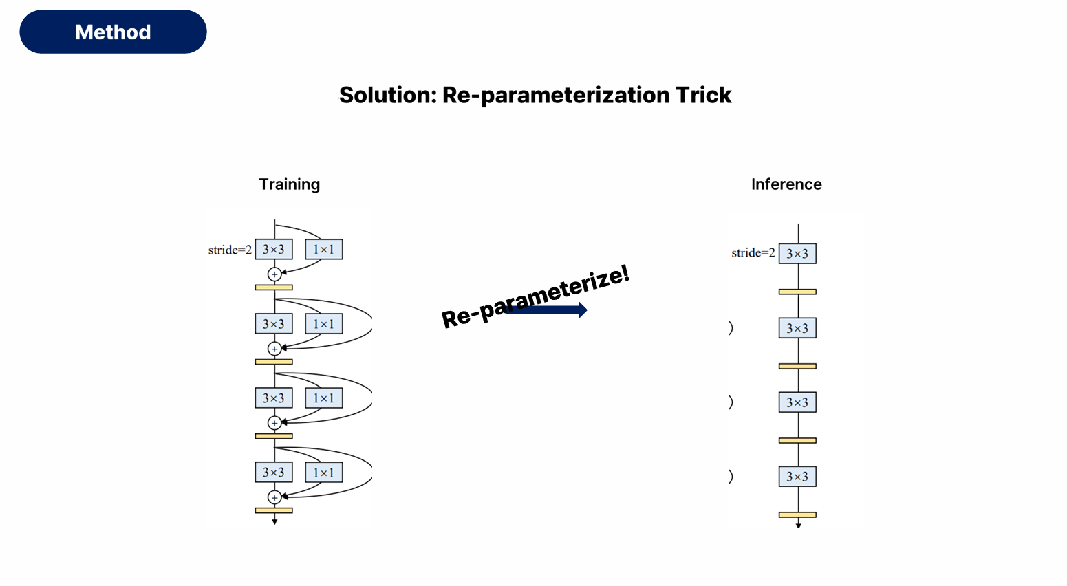 Inference-time: VGG처럼 3×3 Conv + ReLU만 남기는 single-branch (빠르게)