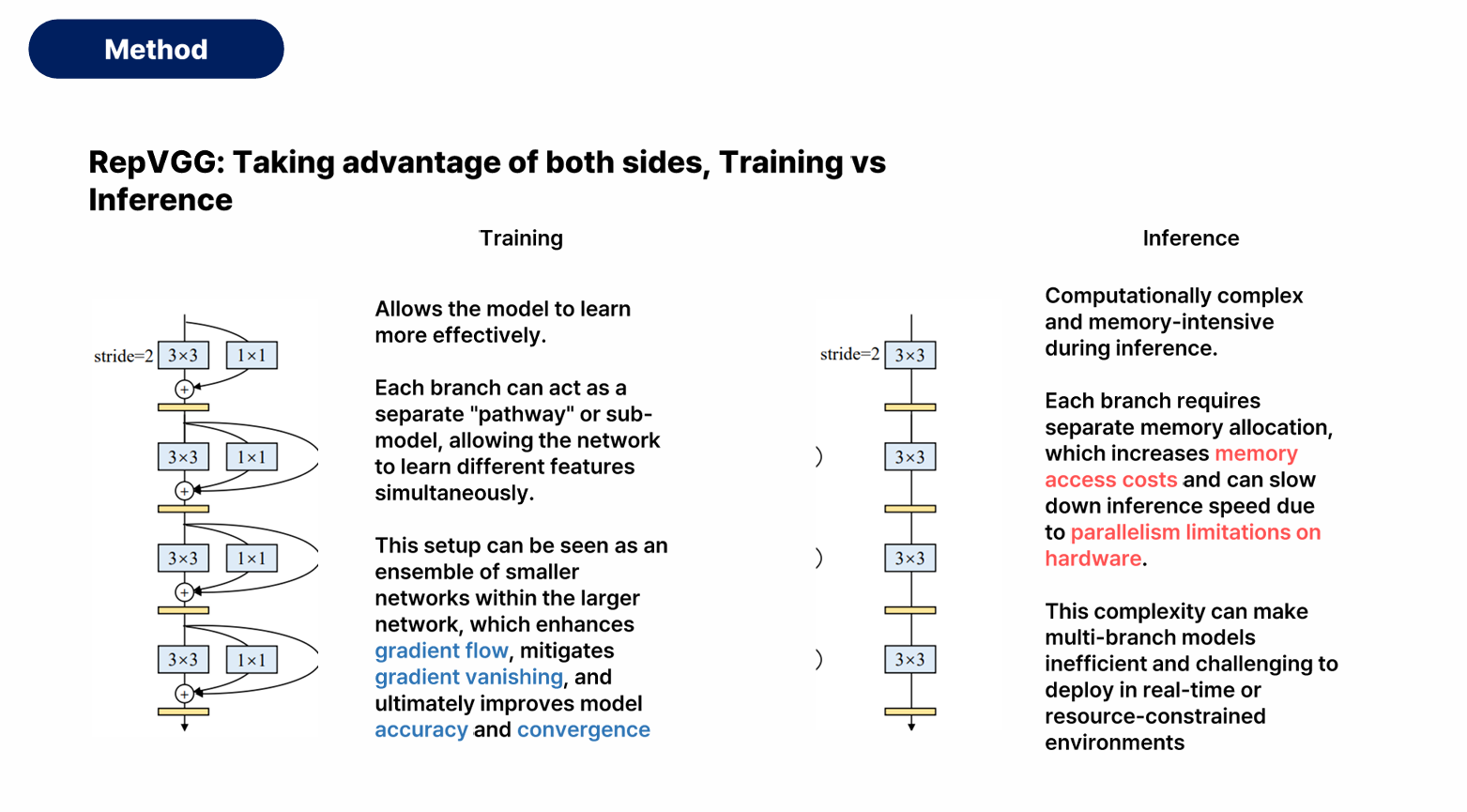 Multi-branch는 여러 경로가 병렬로 특징을 뽑는 구조라서, 앙상블처럼 더 풍부한 표현을 학습하고 gradient 흐름에도 도움이 된다. 반면 추론 시에는 분기마다 메모리 접근/병렬성 제약이 생겨 속도 최적화가 까다로워질 수 있다(구조가 복잡할수록 실제 HW에서 느려질 수 있음). 발표자료가 이 대비를 핵심 동기로 깔아둔다.