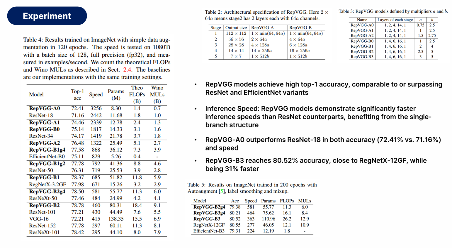 또한 RepVGG-B3가 80%+ top-1에 도달하며, 강한 효율 모델들과의 비교에서도 “정확도-속도” 사이의 balance가 좋다는 것을 보여준다.