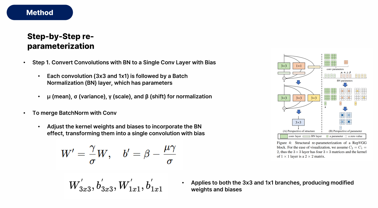 슬라이드에서 볼 수 있듯이, 3x3 Conv, 1x1 Conv, 그리고 Skip connection branch를 전부 3x3 Conv에 fuse(합치는) 방식인데, 이 때 1x1 Conv, skip connection들을 3x3으로 expand해서 합쳐주는 구조이다. 상세한 계산 과정은 아래와 같다.