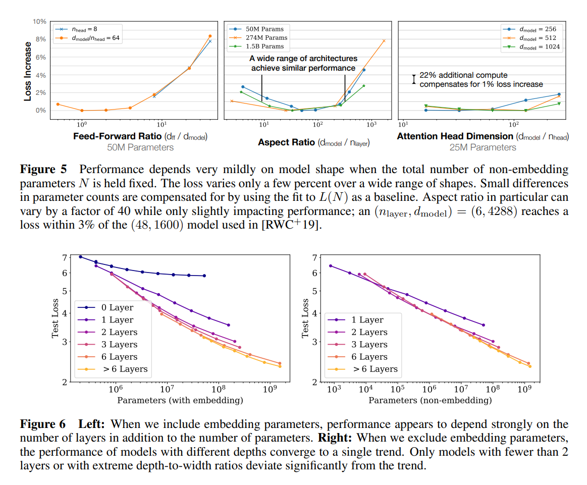 여기를 보면, figure 5에서는 shape에 대한 mild한 변화를 보여주는 반면, figure 6에서는 non-embedding parameter의 수에 따라 굉장히 strict한 상관관계 trend를 보이는 것을 알 수 있다. 참고로 non-embedding param이란,