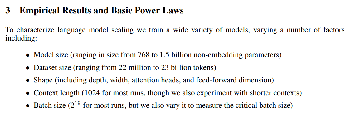 파라미터 수 (N): 성능은 비임베딩 파라미터(non-embedding parameters) 수에 가장 깨끗하게 반응한다.