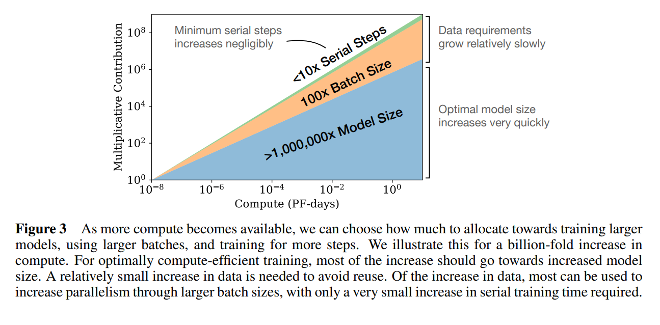 연산량이 충분하다면 학습을 오래 시키는 것보다 모델을 훨씬 더 크게 만드는 것이 성능 향상에 훨씬 유리하다는 것을 보여준다. 위의 차트를 보면 모델 사이즈에 해당하는 파란색 부분이 제일 많이 필요하다는 것을 볼 수 있다. 또한 모델이 커질수록 더 큰 배치 사이즈를 감당할 수 있게 되어, 전체 학습 시간(Serial time)을 크게 늘리지 않고도 막대한 연산량을 효과적으로 소화할 수 있게 되는 것이다.