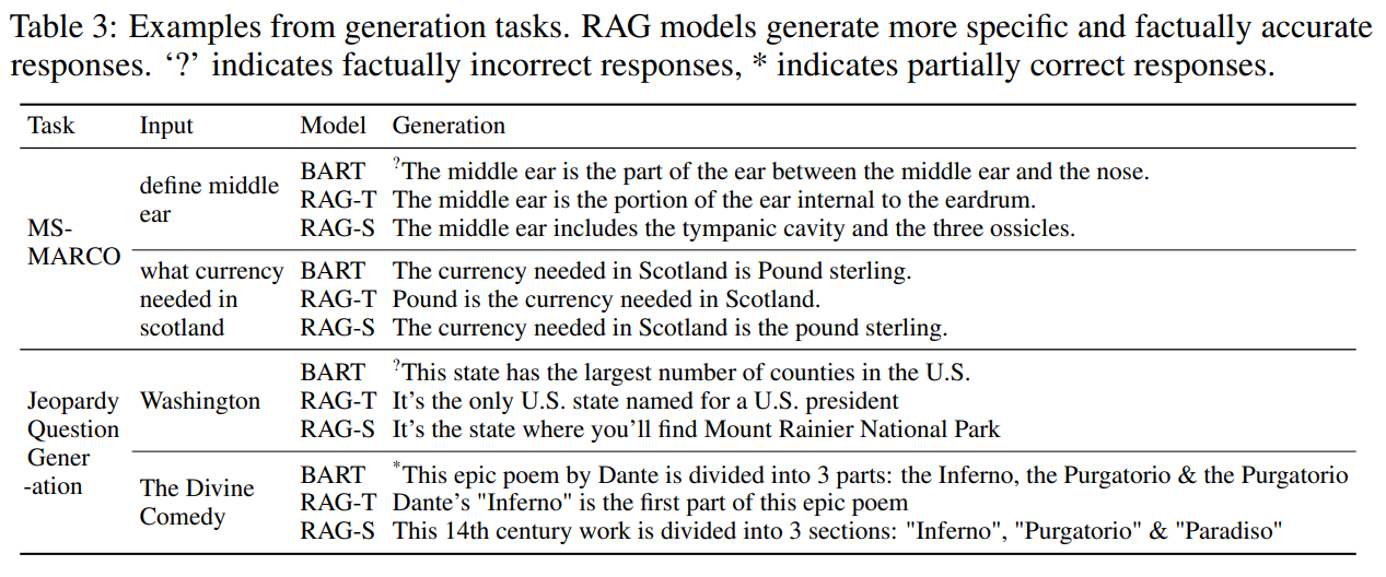 Open-domain QA: Natural Questions, TriviaQA 등 주요 벤치마크에서 기존의 추출 기반 모델들을 제치고 State-of-the-Art(SOTA)를 기록하였고, BART보다 Hallucination 부분이 줄어들었고, 모델을 재학습시키지 않고도 외부 지식 색인(Wikipedia 덤프)만 교체하면 최신 정보를 반영할 수 있음 (Hot-Swapping) 을 보여준다.