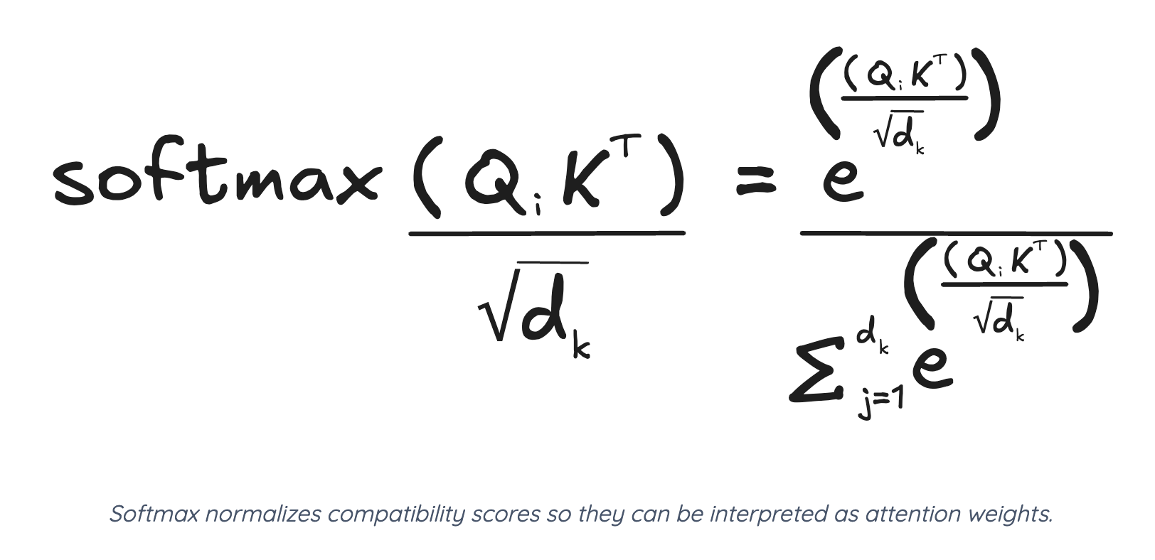 LSTM 게시물에서도 보면 알겠지만 인공지능에서 어떤 숫자를 0-1 사이의 점수로 normalize해줄 때 softmax를 주구장창 사용한다. 밑에 루트 d가 차원 수로 나눠준거다 (너무 커서).