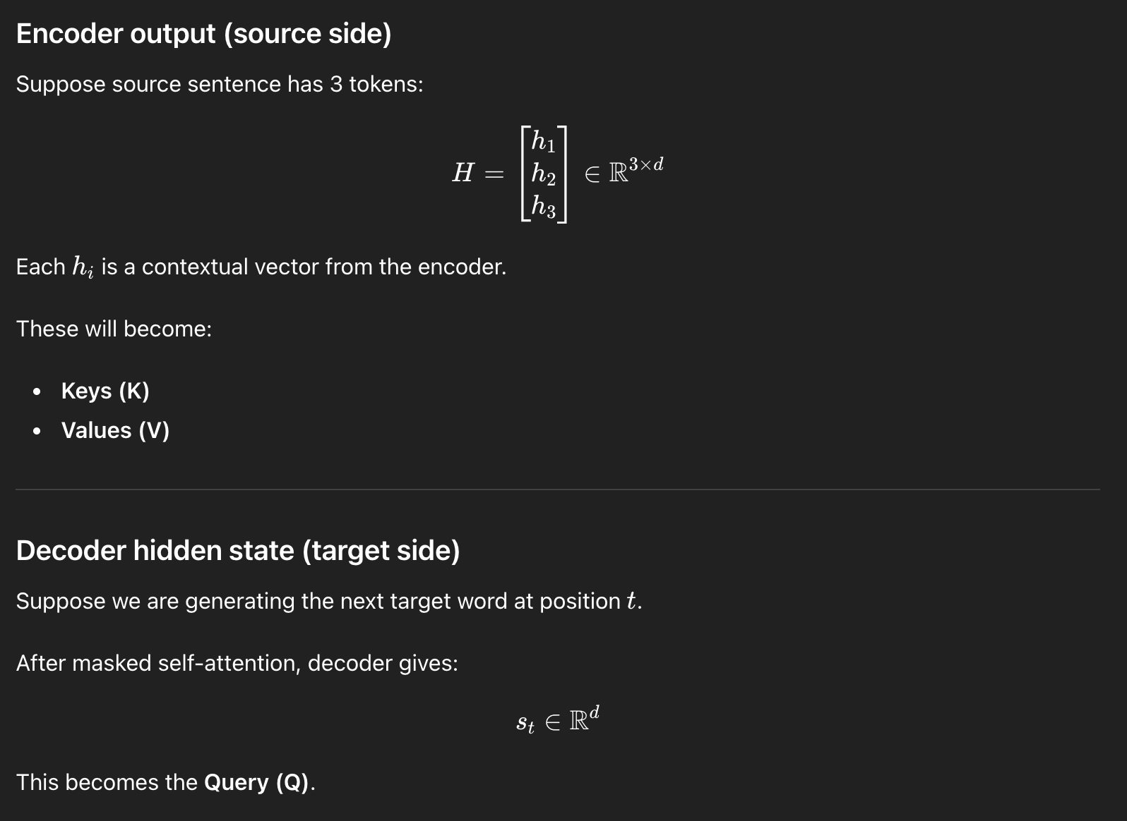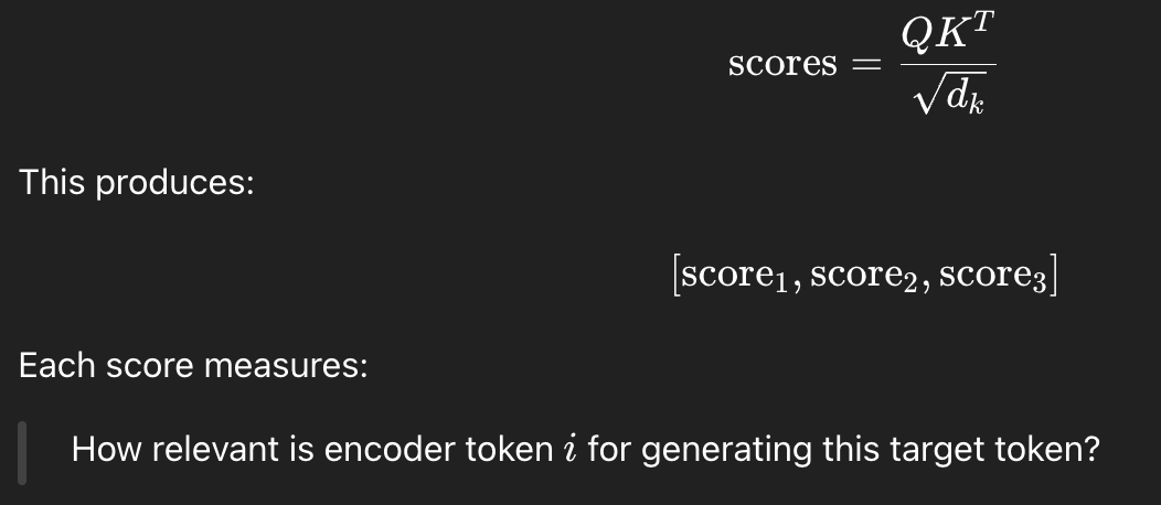 이제 encoder에서 처리한 내용과 decoder에서 처리한 내용을 이어주는 다리가 하나 필요하다. 그 과정이 바로 cross attention이다. cross attention에서는, output의 특정 단어를 생성하는데에 있어서 input의 어떤 단어에 가장 attend할지, 관심을 가질 지를 보는 과정이다.