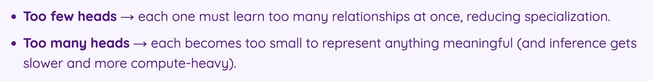 너무 적으면 하나의 attention이 너무 많은 관점을 배워야하고, 내용을 이해하는데 필요한 관점보다 너무 많이 설정하면 하나의 attention이 쓸데없이 작은 (의미가 없는) 관점을 배우게 된다는 내용이다. 뭐든지 적당히 내용에 맞게 하는게 generalization과 performance에 좋을 것이다.