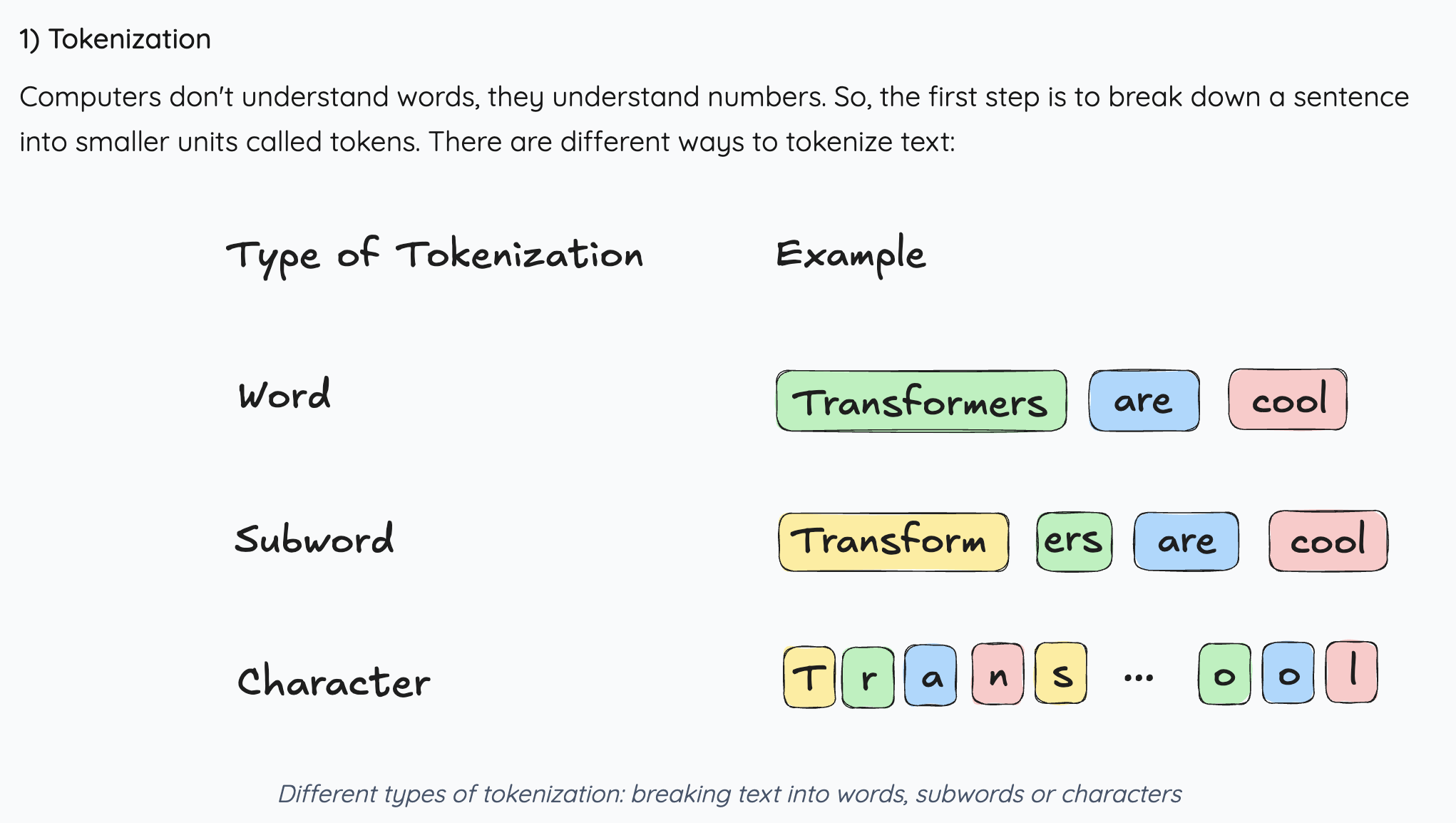 Transformers are cool이라는 문장을 각각 다른 type의 토크나이저로 분해한 결과물이다. 이처럼 문장/단어를 쪼개서 뭔가 각각의 토큰으로 만들어주는 것이다.
