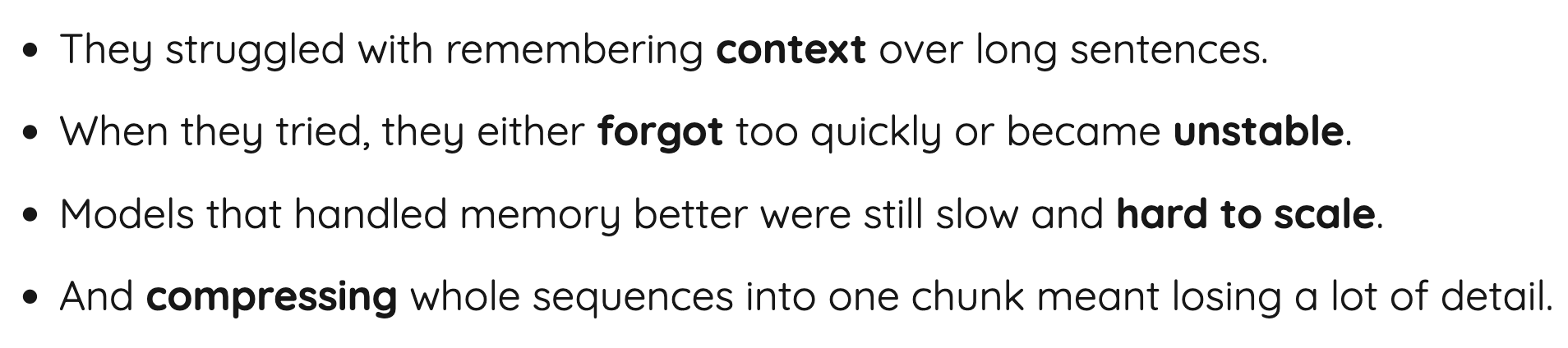 그리고 이제 transformer인데, attention을 이용해서 위치적 정보를 맥락에 넣어주고 long range dependency도 가능하게 해주었으며, 병렬 연산과 줄어든 traning time을 제공해준다. 문제는 attention 계산이 quadratic하게 expensive하다는 점과 효과적인 훈련을 위해서는 large dataset이 필요하다는 점이다.