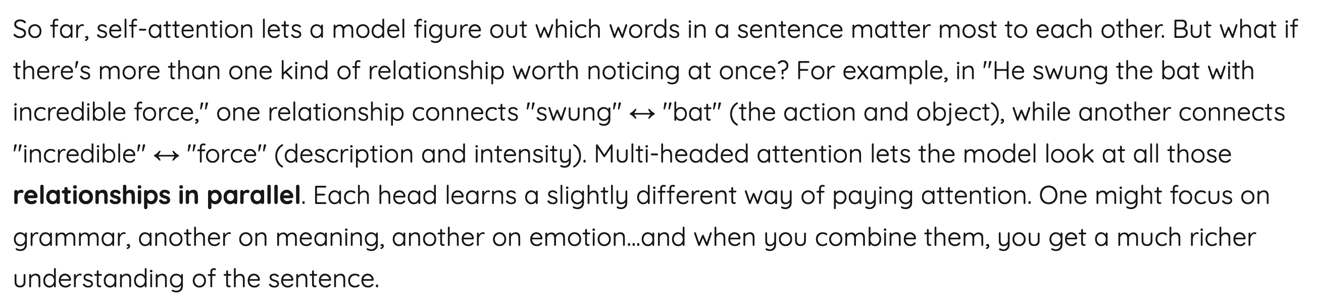 우리가 사회를 살아갈 때도, 한 문제에 대해 여러가지 관점을 가진 사람들이 있을 수 있다. 이들을 한데 모아서 문제 해결을 시킨다면 더 효과적인 문제 해결 방법이 나올 수도 있지 않을까? Multi head attention도 이런 느낌이다. 다음의 설명을 읽어보자.
