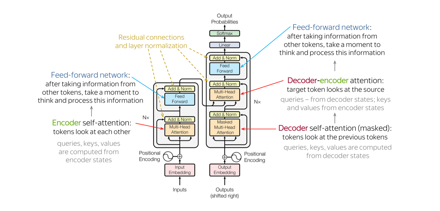 이외에도 residual connection과 positional encoding 부분이 있다. gradient가 더 잘 흐르게 해주는 skip connection 부분과, token의 위치정보를 넣어주는 positional encoding 부분이 있겠다.