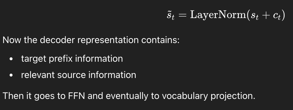 이후 seq2seq가 나오면서 encoder-decoder 구조가 소개되고, encoder가 input을 받아서 '고정된' 길이의 벡터 output으로 내주면 decoder는 그걸 받아서 (Context vector) 단어 하나가 들어가면 다음 단어를 예측하는 식으로 한 스텝씩 처리되는 과정을 거친다. 전체 input을 fixed length vector로 내기 때문에 모든 context 정보를 다 집어넣기가 어려웠던 단점이 있다.