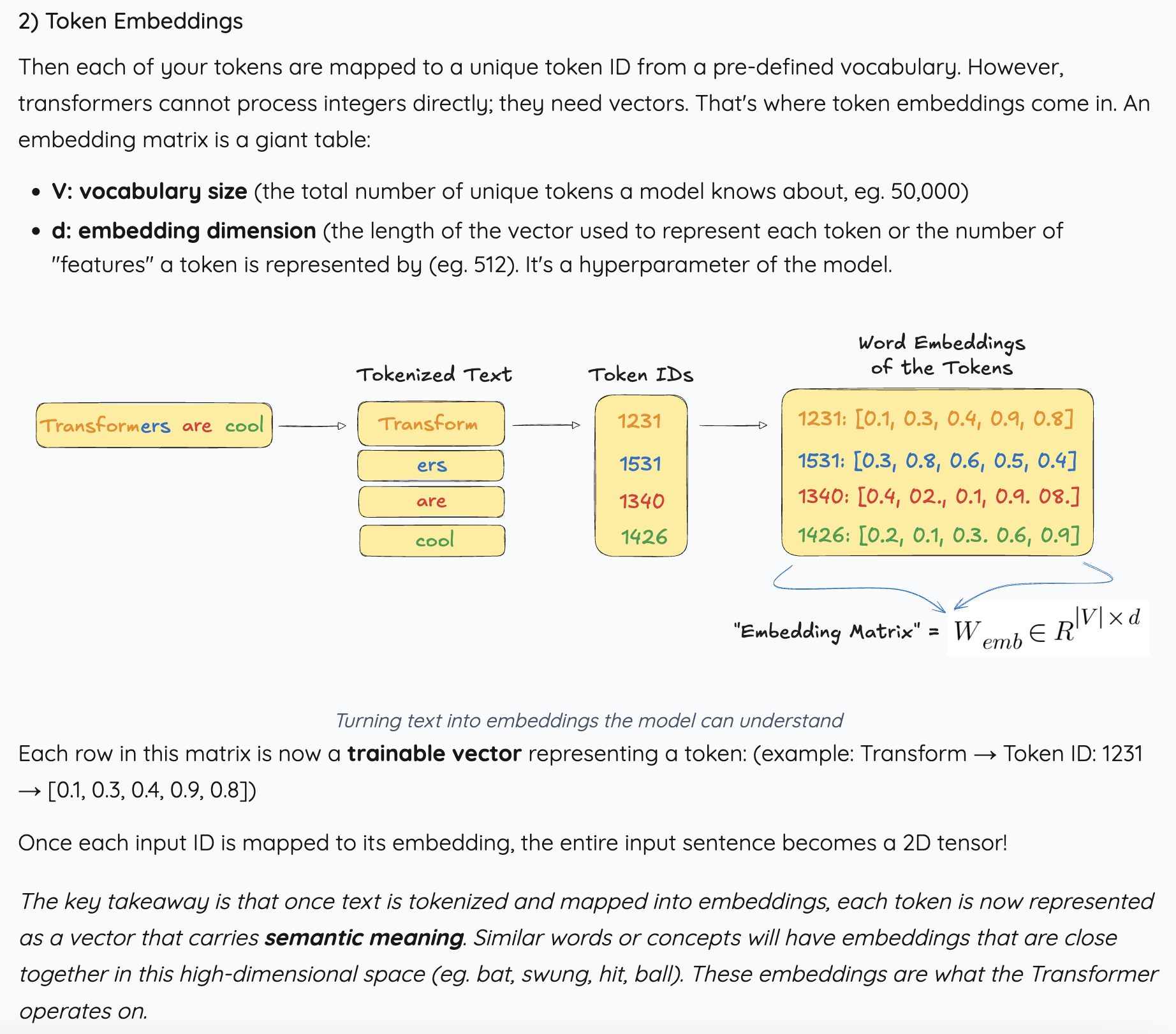 그 다음에 각각의 토큰들에 unique한 ID를 부여하고, 그 ID를 vector로 만들어주는 과정이 바로 word embedding이다. 여기서 가장 중요한 부분은 유사한 단어나 의미를 가진 vector들이 high-dim representation 공간 안에서 서로 가깝게 위치해 있을 것이라는 부분이다. 이 embedding을 가지고 Transformer는 노는 것이다.
