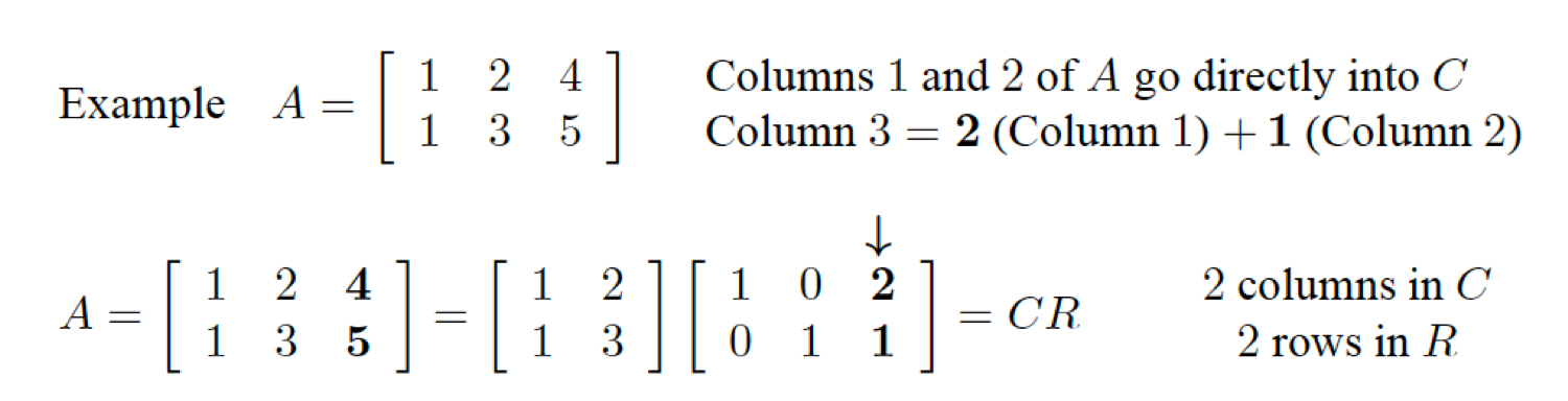 왜 CR factorization이냐 하면, 일단 factorization이 분해라는 뜻입니다. 그러니까 직역하면 CR 분해입니다. 지금부터 행렬 A를 행렬 C와 행렬 R 간의 곱으로 분해해 볼 것입니다.